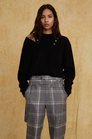 Distressed wash with whiskering for a vintage feel, our Stevie offers the most feminine fitting barrel leg jean. Use the double belt loops and sash to cinch in for a flattering high waist and back shape. Accented with wide legs that lightly taper at the cropped hem. Style our Stevie back to our Dixie Asymmetrical Puff Sleeve Sweater for a fall-ready look.