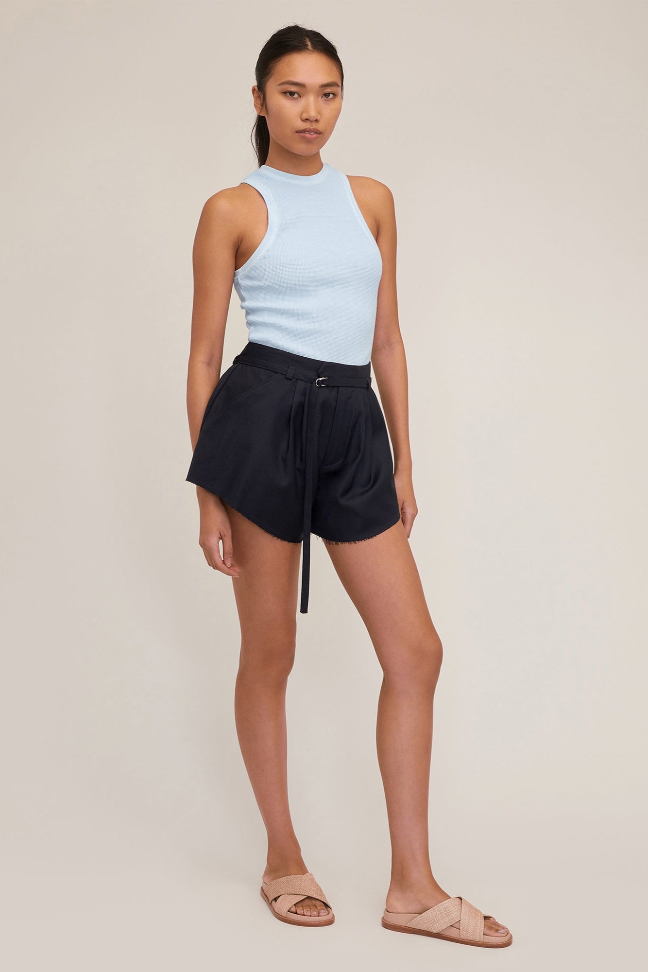 From coffee to cocktails, the Alina Suit Short in dark navy can be dressed up or down, making it versatile for a range of occasions. Raw-edged hem detailing with a slightly rounded leg opening gives this luxurious suit short an edgy yet effortless twist. Hook up with our Arley Blazer Vest for a polished and updated modern suit.
